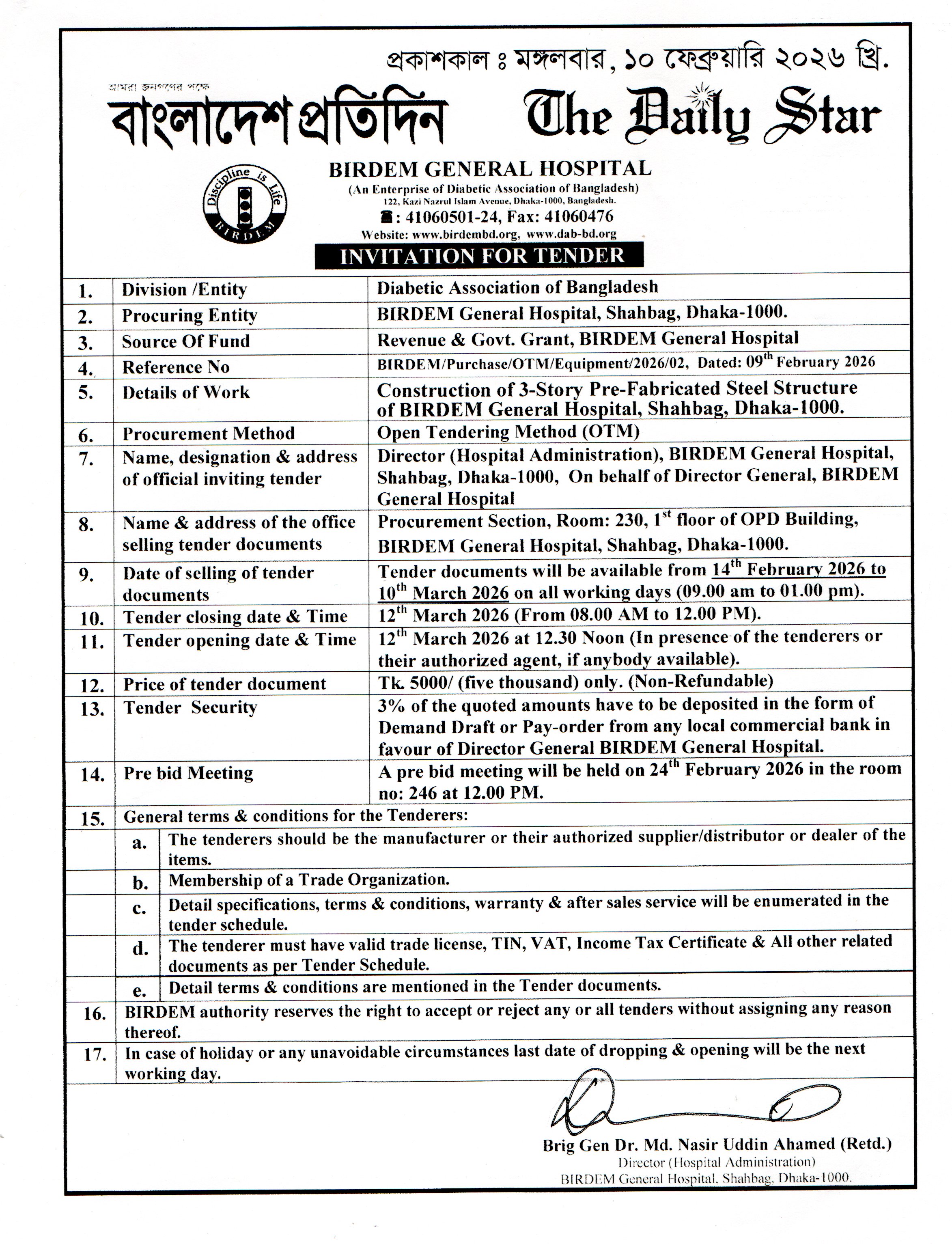 Construction of 3-Story Pre-Fabricated Steel Structure of BIRDEM General Hospital (Closing Date-10 March 2026) |